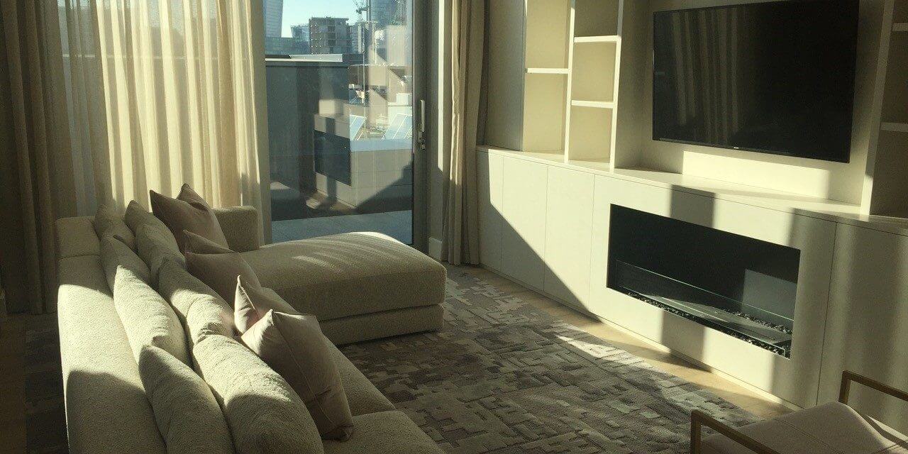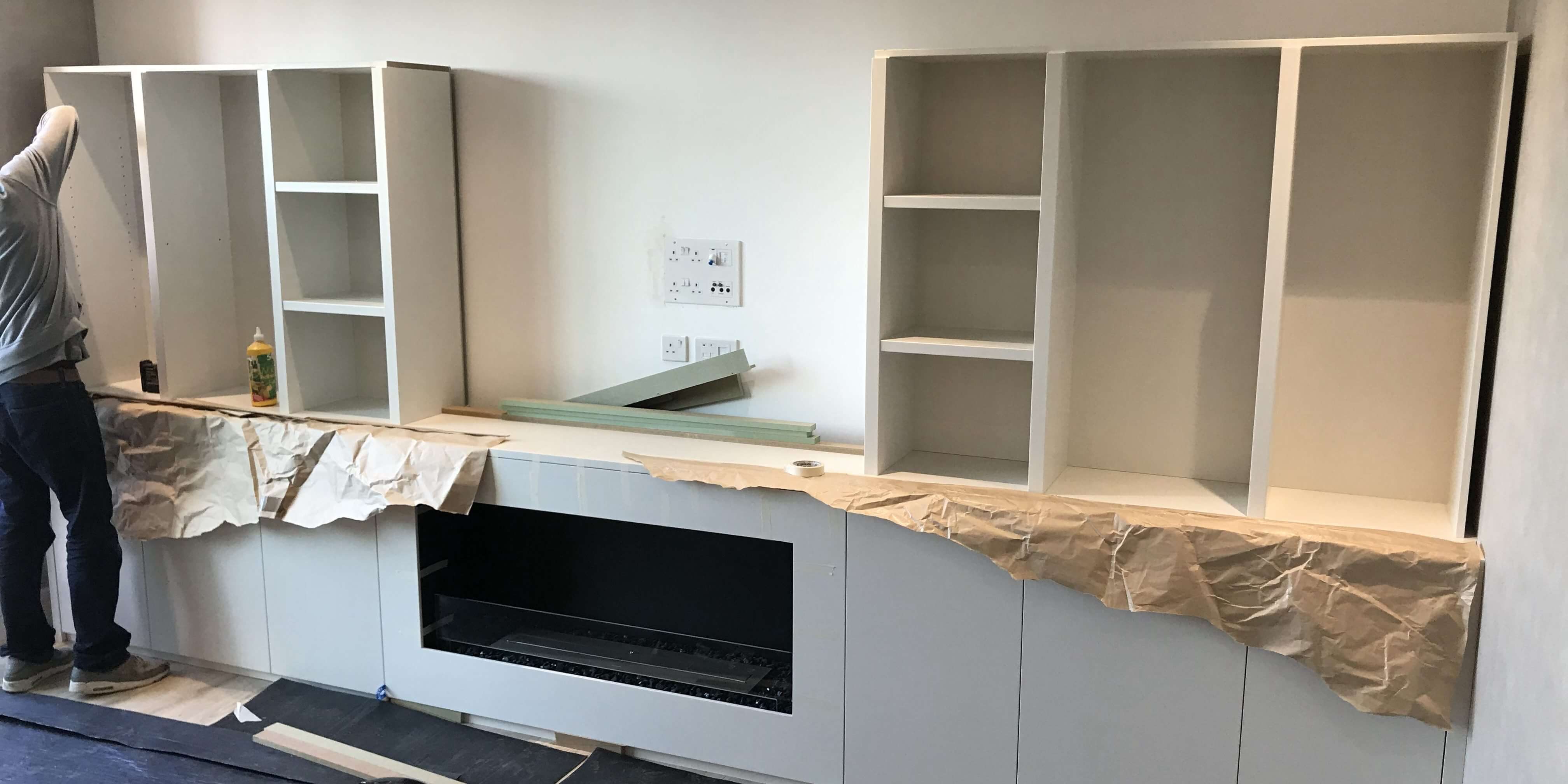 Heat was going to be an issue with the surrounding units which were made of spray painted MDF, so we had to work closely with the fire installation team and manufactured a box constructed in heat resistant board to contain the fire and make sure it complies with regulations and wouldn’t cause any problems down the line, we also used fire resistant paint to spray the front panel of the fire which we cut in 12mm Promafour Supalux.