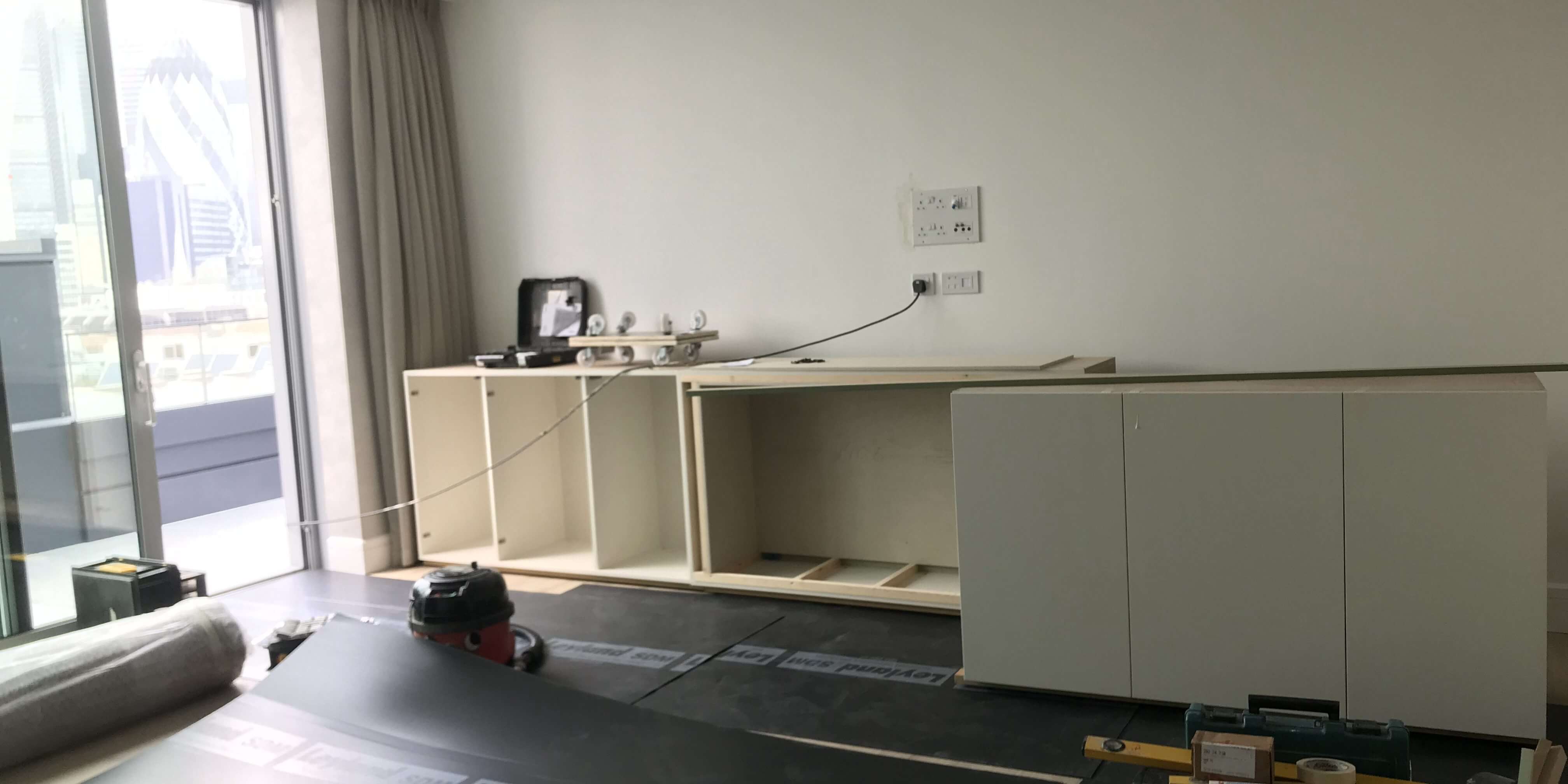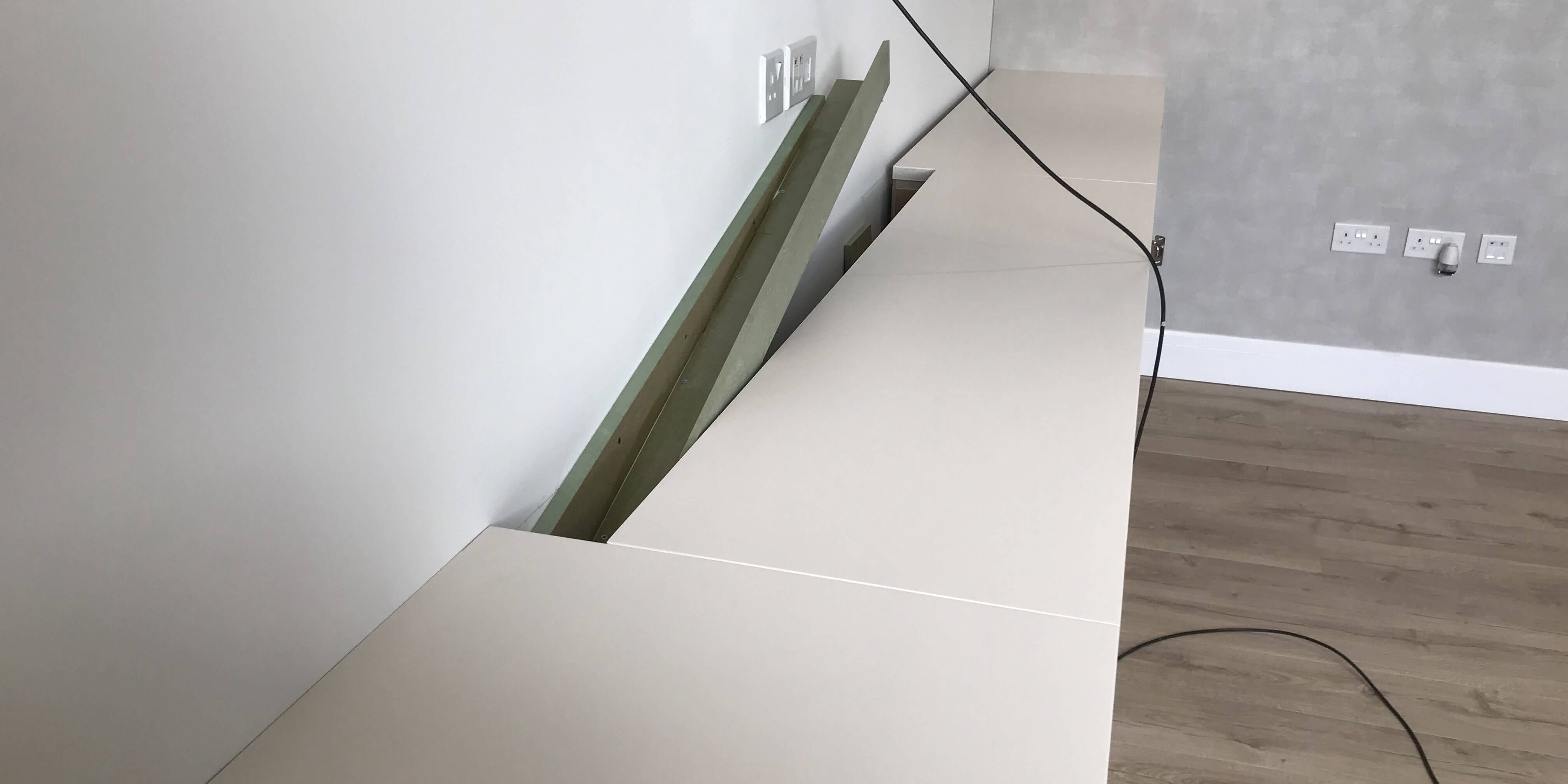 The TV bracket was mounted to a strengthened back panel that had a gap behind and a sloping cable trough so the cables between the TV and satellite box and Playstation could be routed seamlessly and easily to the left hand base cabinet.