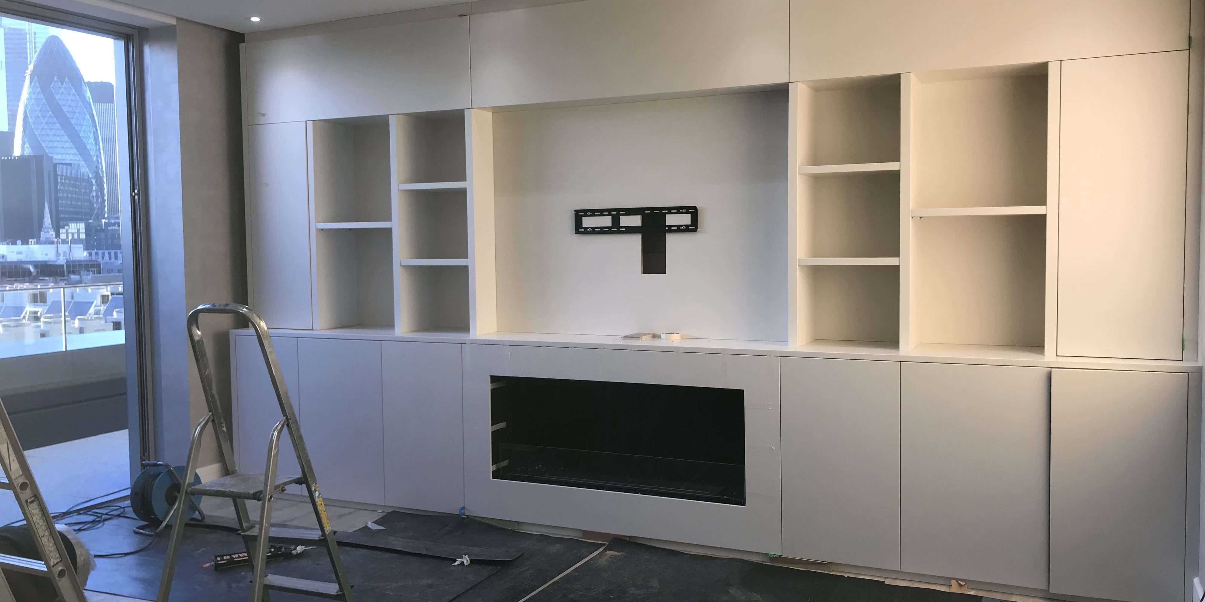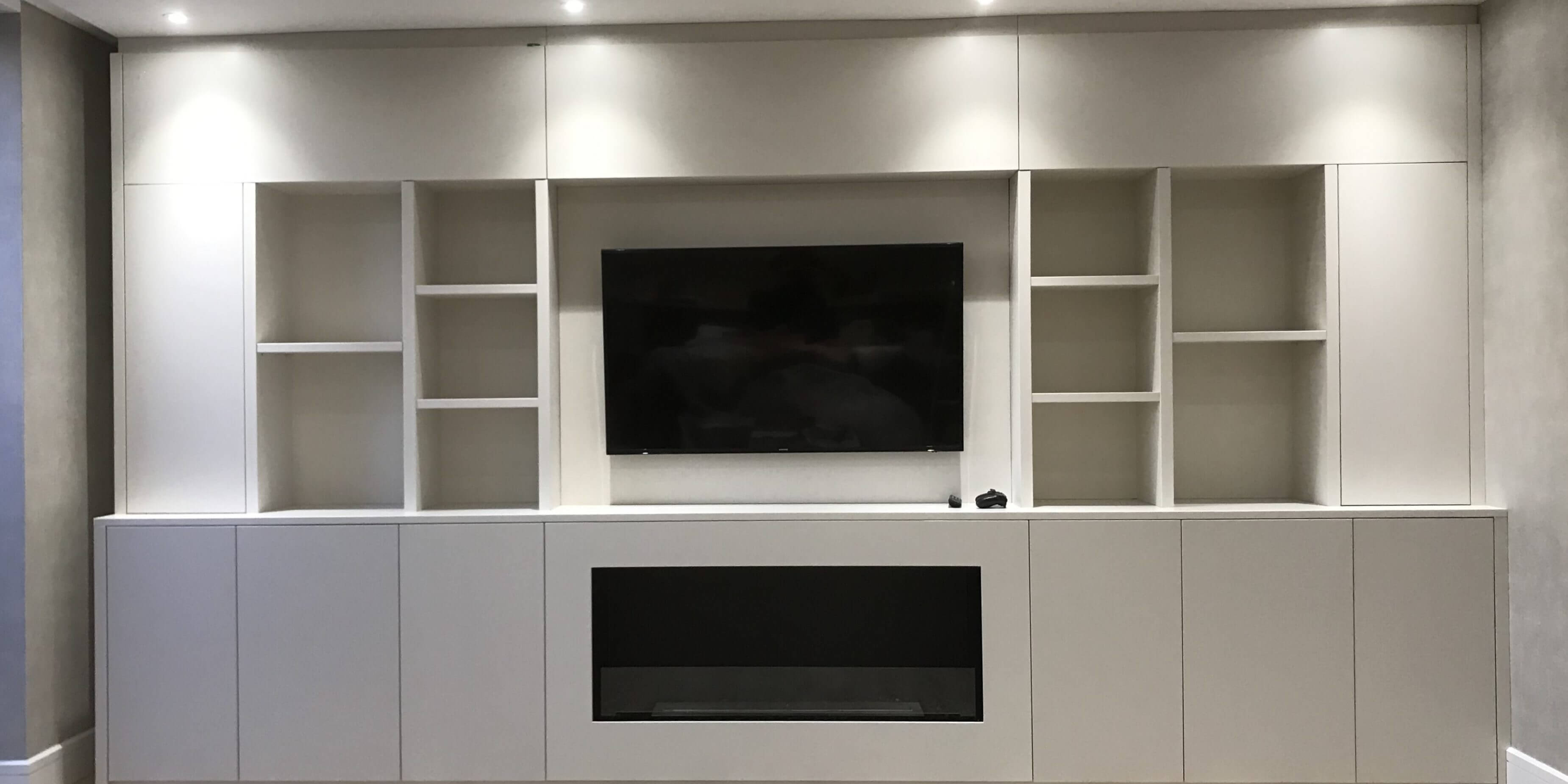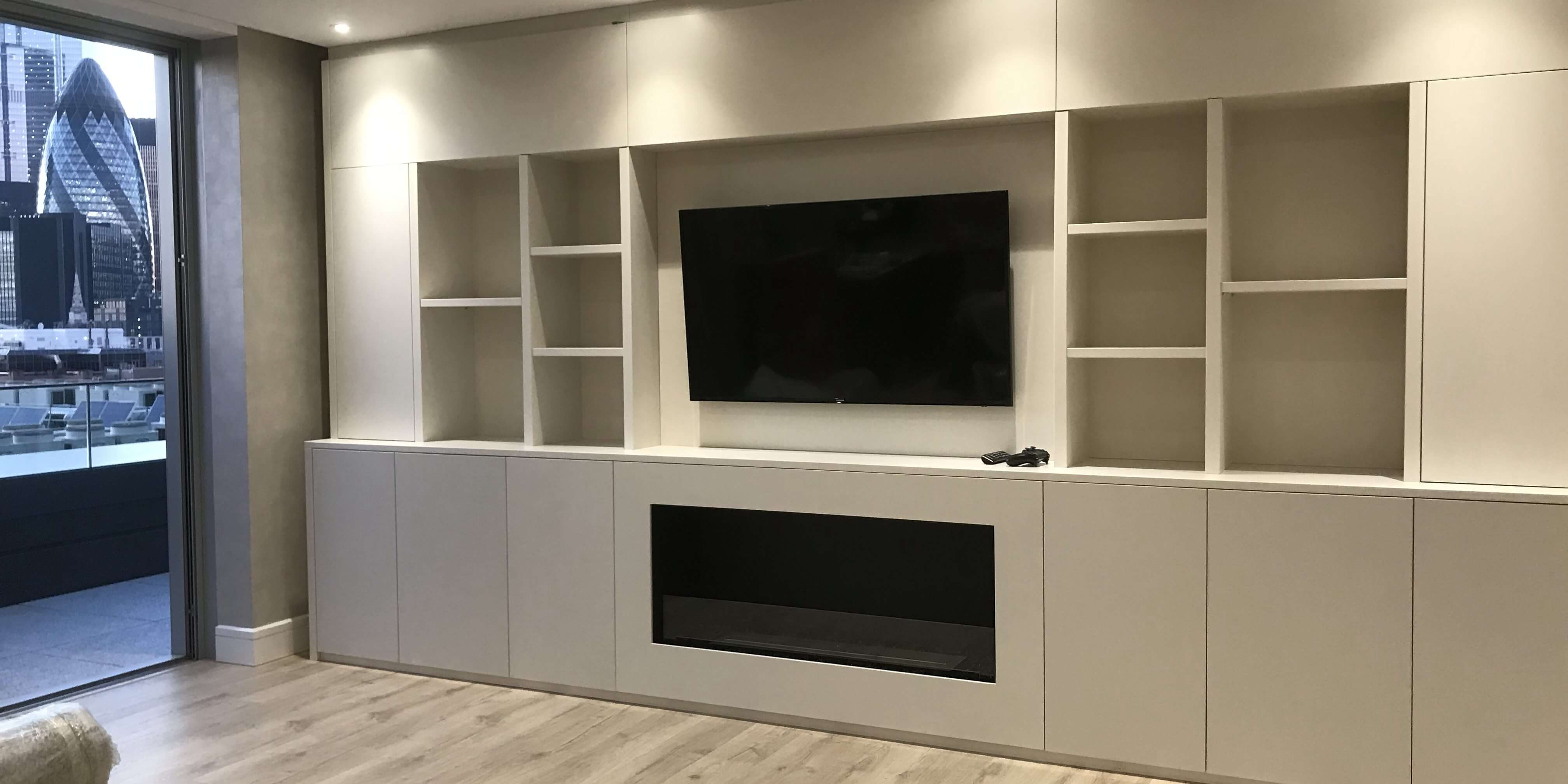 We worked with Interior Design Company Jo Hamilton Interiors to help create this beautiful full wall fitted media storage and shelving unit. This unit was unusual as it contains a flush fitting fireplace and the designers wanted the transition between the joinery and the fireplace to be seamless and the same colour throughout.